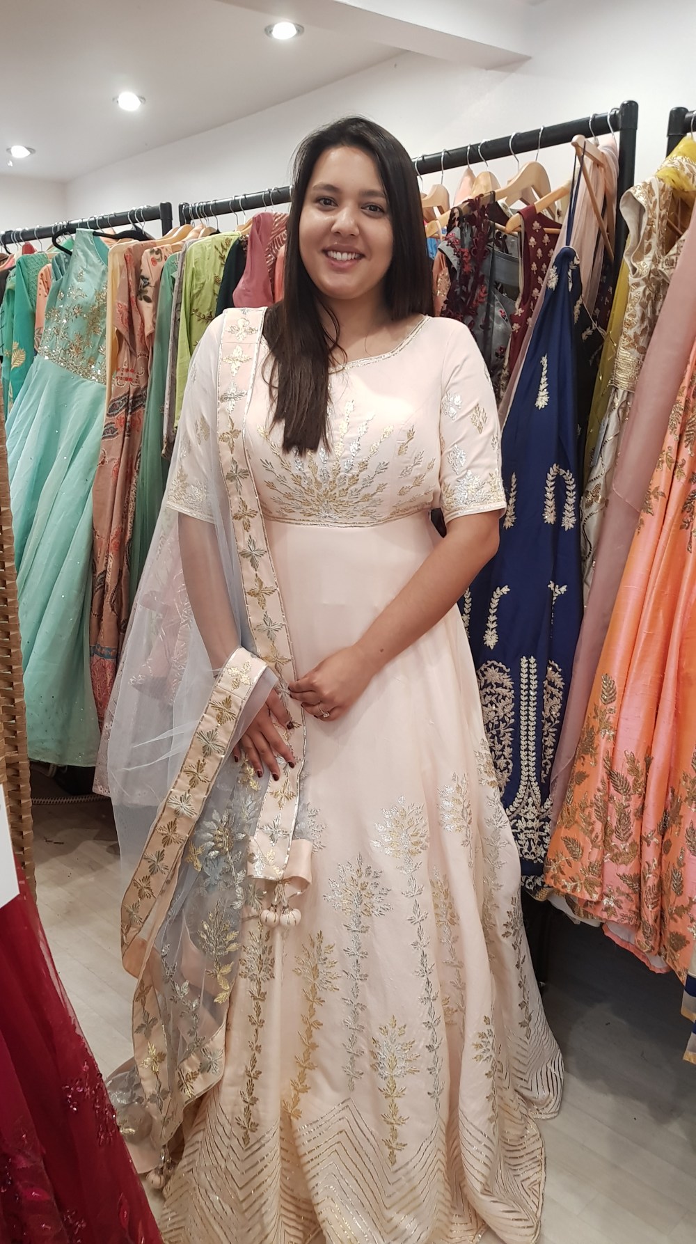 Next, the outfit, that was a toughie, as with an engagement dinner, it is ideal to wear something which is comfortable and easy to walk around in. I know one brand I could rely on had to be Nysa London. Known for being friendly as well as budget-friendly, their range of attire is quality and just STUNNING! I headed down to their home-based boutique in North London, and you are always welcomed with the biggest smile and seriously I was spoilt for choice!!! But as soon as I put on their blush pink anarkali, I LOVED IT (as you can tell by the grin on my face in the photo above!). The anarkali had a gracious drama to it with and was a breeze to stroll around in and best of all, it had the best of both worlds with gold and silver thread work, and a beautiful net dupatta to go with it.